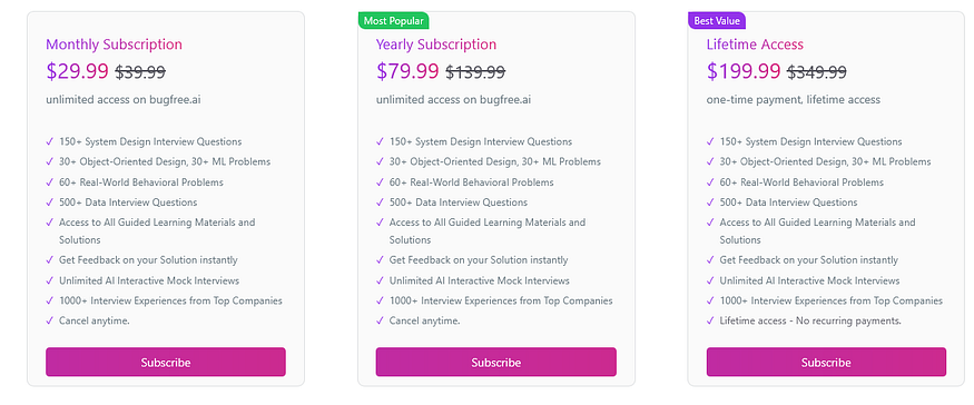 If you want AI mock interviews on System Design then I highly recommend you to join Bugfree.ai in 2026. They are also offering over 40% discount on their lifetime plan, another awesome Black Friday and Cyber Monday deal for developers preparing for System Design interviews in 2026