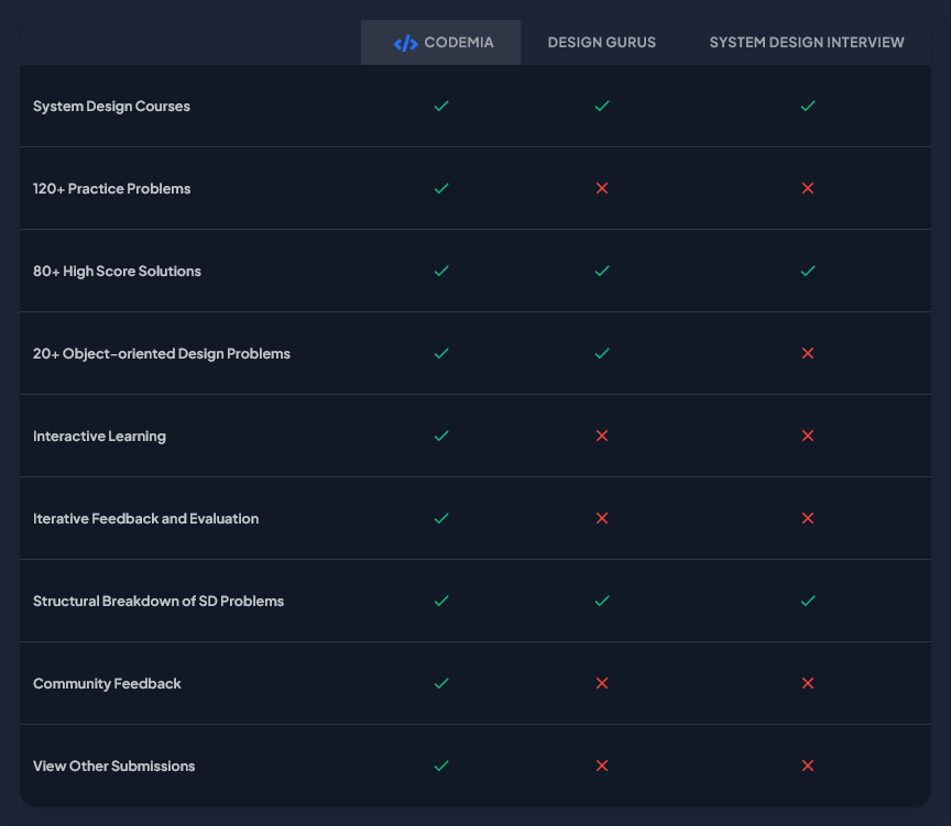 Here is also a nice comparison chart of Codemia.io with other popular System Design interview prep platforms like DesignGurus.io and Educative.io etc
