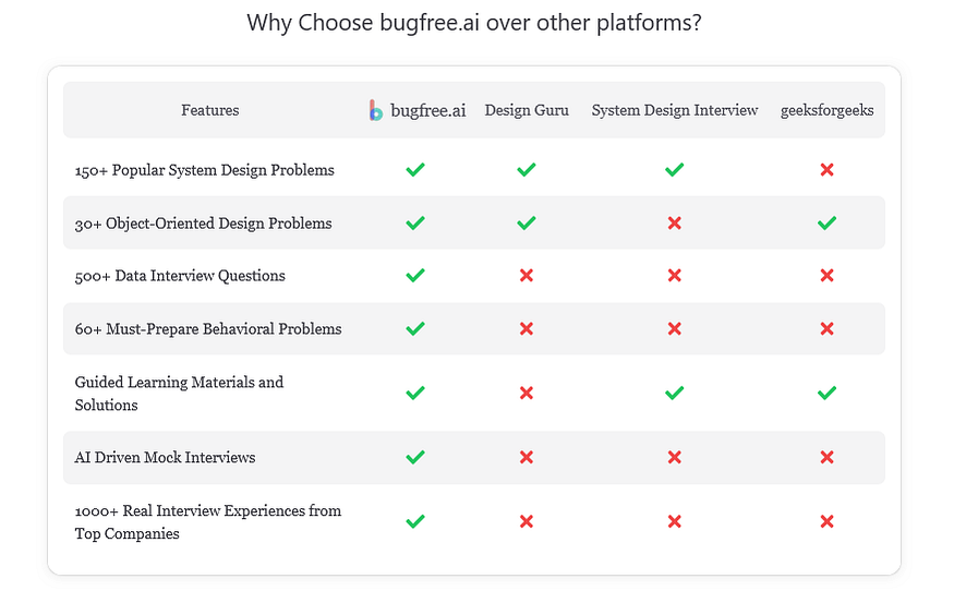 Here is also a nice comparison chart for Bugfree.ai vs DesignGurus.io, Educative.io, and geeksForGeeks