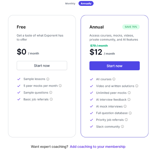 If you ask, me I highly recommend you to join Exponent as $12 per month is nothing if it helps you slightly bit to get a job in FAANG and your dream company.