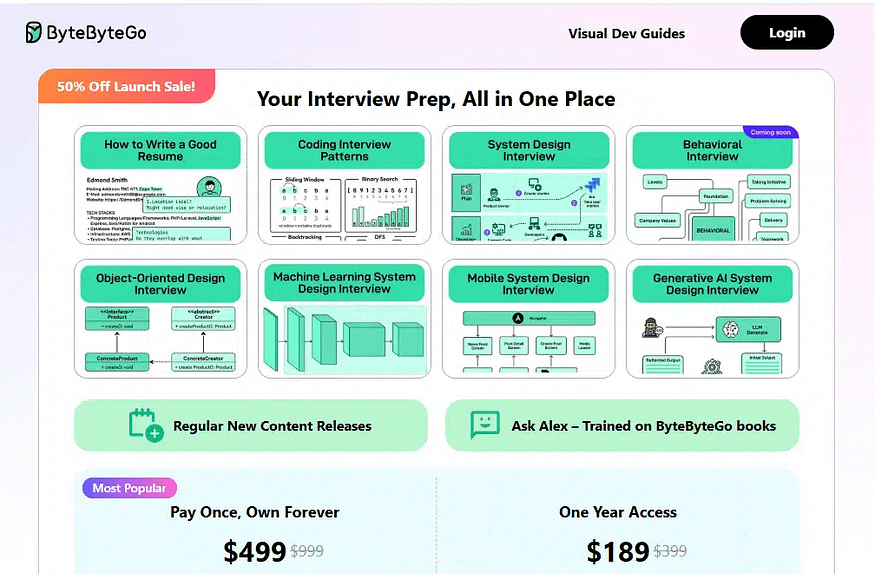 ByteByteGo has become one of the most complete system design platforms available today. What makes it stand out is its visual-first explanation style, which mirrors how interviewers actually expect you to reason during design rounds.